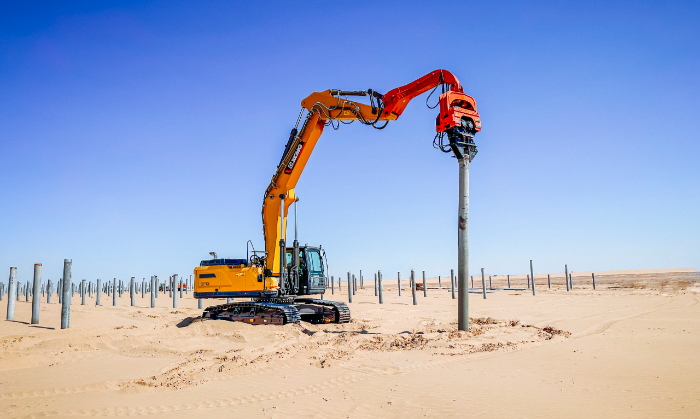 此次徐工挖掘機(jī)參建的巴彥淖爾100萬(wàn)千瓦光儲(chǔ)+生態(tài)治理項(xiàng)目位于內(nèi)蒙古西部,是自治區(qū)年度重點(diǎn)工程,對(duì)當(dāng)?shù)刭Y源開(kāi)發(fā)和綠色發(fā)展具有重要意義。 與以往常規(guī)項(xiàng)目不同,此次徐工挖掘機(jī)主要擔(dān)任光伏樁的鋪設(shè)工作,通過(guò)改裝振動(dòng)錘和引孔機(jī)等多功能屬具,有效滿足現(xiàn)場(chǎng)多元化施工需求。