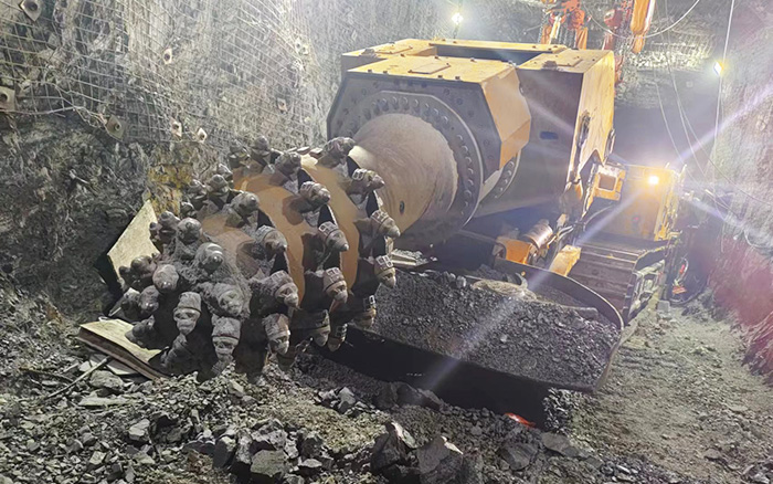 該礦施工斷面5m*4.5m,巖層硬度在60MPa左右,客戶所選購的徐工XTR7/360掘進(jìn)機(jī)最大截割高度7.2m,可實(shí)現(xiàn)中等斷面隧道一次開挖成型,切割頭配合硬巖截齒,掘進(jìn)時(shí)可以向巖壁施加每平方厘米1.5噸的力量,在機(jī)動靈活的基礎(chǔ)上兼具掘進(jìn)硬巖的優(yōu)勢。