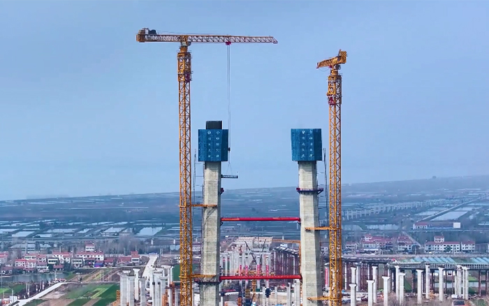 大橋主墩建設(shè)是整座大橋順利完工的“壓艙石”,大橋北主塔高度211.75米,采用主塔鋼筋部品整體吊裝。作為徐工超大塔中的明星產(chǎn)品,兩臺(tái)徐工XGT2230A-100S扛起大橋北主塔的施工重任。