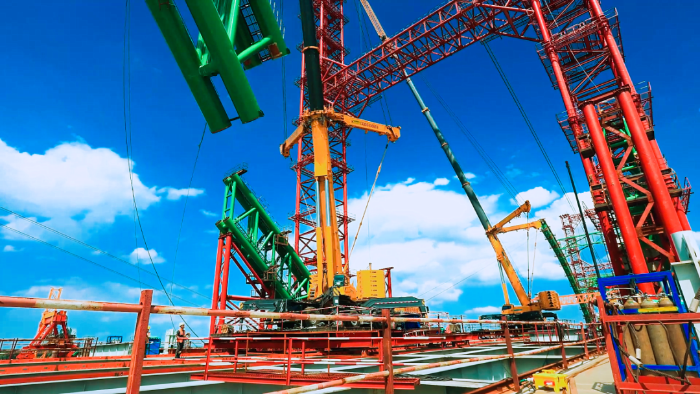 該黃河特大橋是目前國(guó)內(nèi)規(guī)模最大的下承式鋼管混凝土系桿拱橋,作為架起拱橋主拱圈“骨架”——拱肋的主力,徐工起重機(jī)是如何架起“彩虹”的呢?