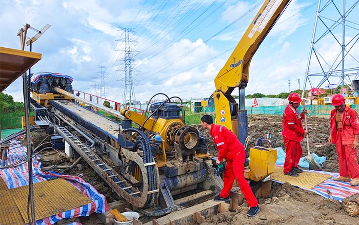 為了確保定向鉆穿越有序推進和回拖順利完成,徐工技術(shù)人員隨項目部提前對現(xiàn)場進行實地勘察,培訓作業(yè)人員,開展管道回拖演練。施工過程中,擴管回拖到泥巖層時,土質(zhì)粘稠抱鉆,徐工XZ6600水平定向鉆機搭載的“扭矩自適應自動巡航施工技術(shù)”“多工況調(diào)速和旋轉(zhuǎn)”“推拉多檔控制技術(shù)”為回拖提供了更大的扭矩,確保了工程順利推進。