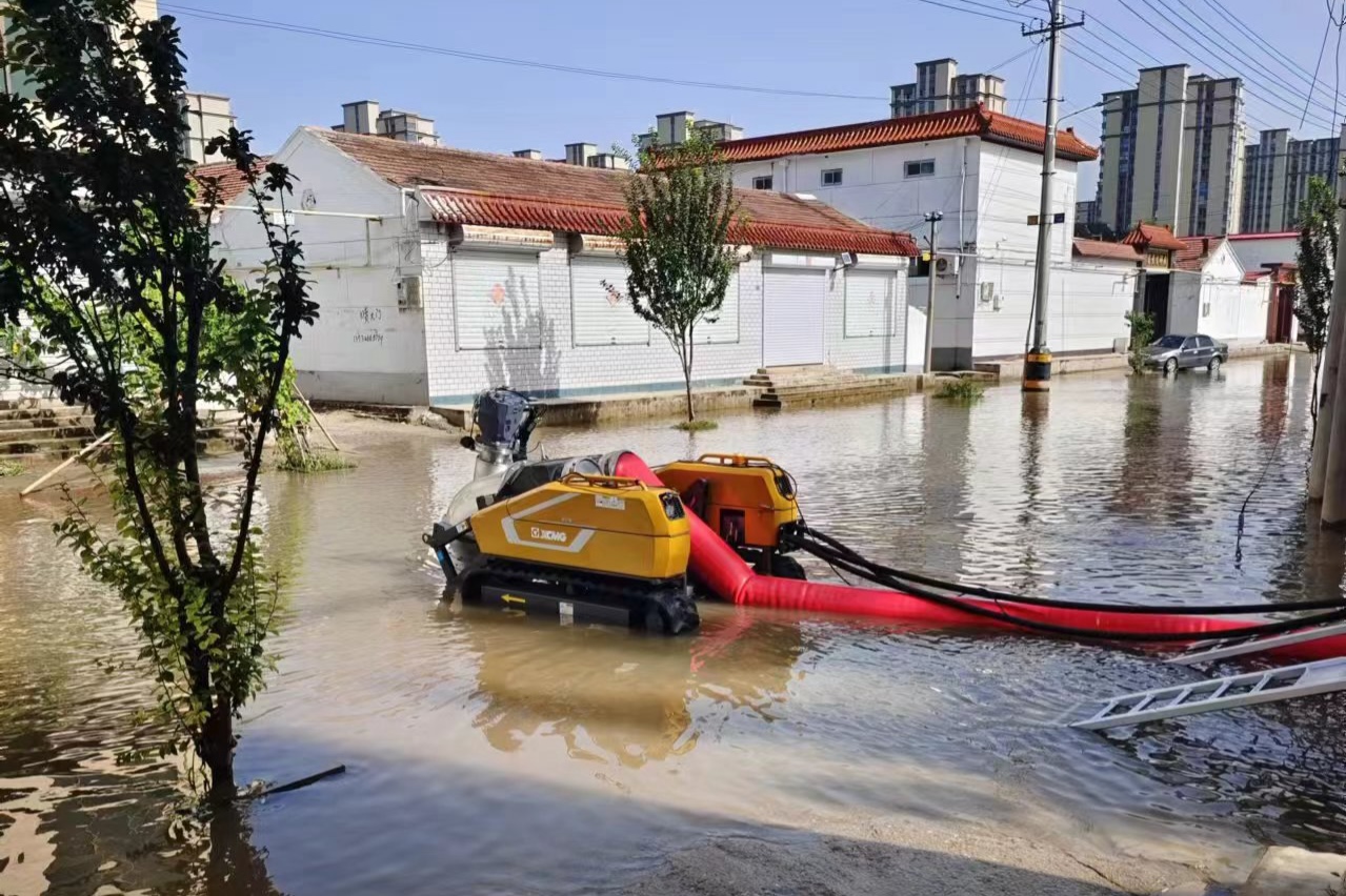 首日,車輛到達現(xiàn)場后,徐工救援人員立即針對現(xiàn)場環(huán)境制定排水方案。由于場地狹窄,大型救援車輛轉(zhuǎn)彎調(diào)頭不便,最終救援人員決定充分發(fā)揮“子母式排澇車”子車探入作業(yè)與履帶底盤小半徑轉(zhuǎn)彎優(yōu)勢,將母車停至路口,遙控子車帶著120米水帶“穿街走巷 靈活走位”,將積水源源不斷排入下水道。連續(xù)作業(yè)6小時后,PS30F4累計排水超14000立方,因雨勢逐漸增大,第一天救援被迫中止。