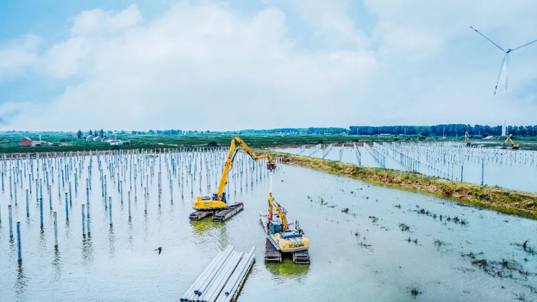 在漁業(yè)較為發(fā)達(dá)的濱海港鎮(zhèn),“漁光互補(bǔ)”光伏發(fā)電項目建設(shè)正如火如荼,項目現(xiàn)場,徐工水上打樁機(jī)的身影隨處可見。