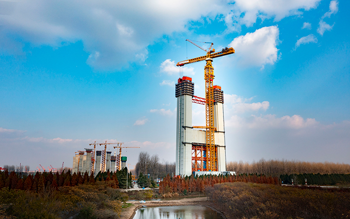 “北主塔分為三十個節(jié)段建設,橋塔2至30節(jié)段中最重的一個達522噸,必須使用塔吊平穩(wěn)吊裝和拼接,確保毫米級精度?!表椖控撠熑私榻B。