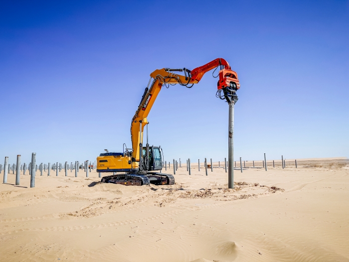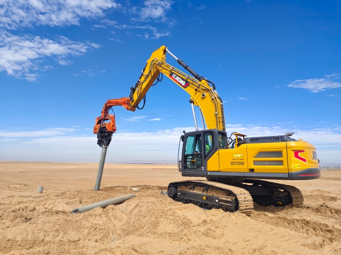與以往常規(guī)項目不同,此次徐工挖掘機(jī)主要擔(dān)任光伏樁的鋪設(shè)工作,通過改裝振動錘和引孔機(jī)等多功能屬具,有效滿足現(xiàn)場多元化施工需求。
