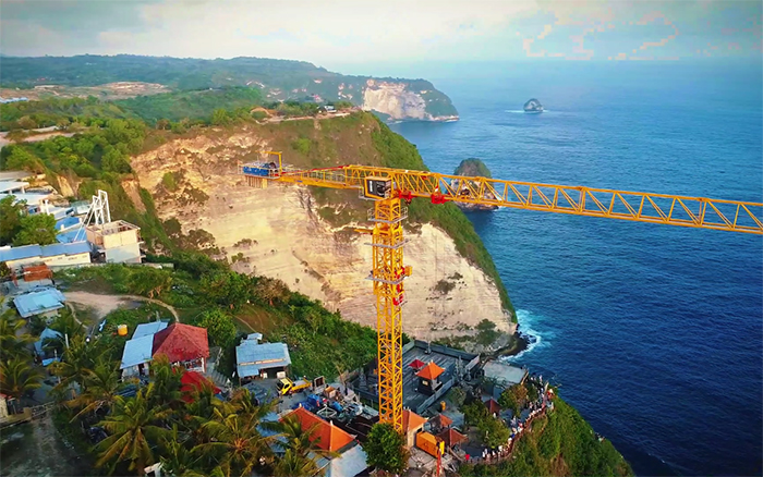 碧藍海灣、潔白沙灘,在旅游勝地印尼巴厘島,徐工XGT360-20S1屹立在懸崖峭壁之上,眺望懸崖海景和奇特的海岸線景觀,為巴厘島佩尼達精靈海灘觀光電梯項目注入徐工“動力”。