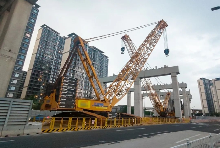 面對有限的操作空間,兩臺徐工XGC11000(650噸級)履帶起重機(jī)采用42米標(biāo)準(zhǔn)主臂工況,分別精準(zhǔn)定位在梁體兩側(cè)狹窄區(qū)域內(nèi),將重達(dá)60噸的預(yù)制混凝土預(yù)制梁,穩(wěn)穩(wěn)吊離運梁車,梁體全程保持水平“懸浮”。
