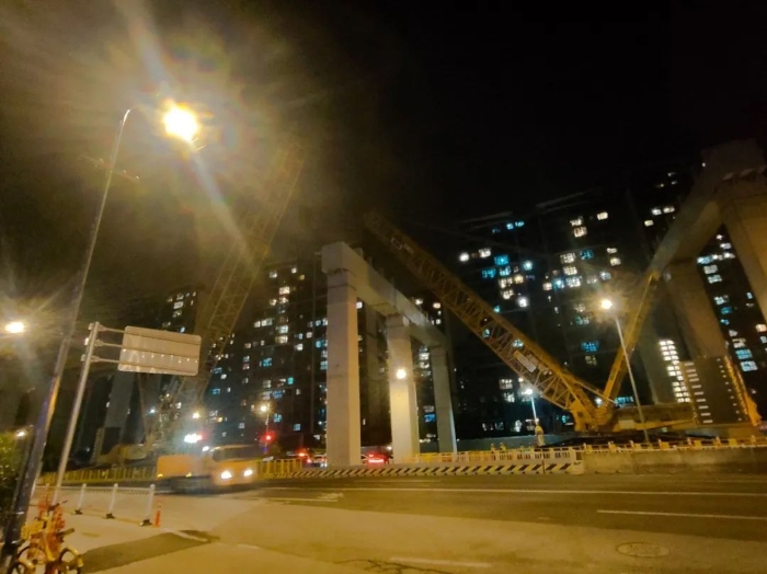 狹窄空間內(nèi),兩機(jī)協(xié)同微調(diào),在進(jìn)行精確轉(zhuǎn)場移動的同時,也避免了任何晃動或扭轉(zhuǎn),重物分毫不差地平穩(wěn)落位至預(yù)定橋墩支座上,整個過程高效流暢,一氣呵成。