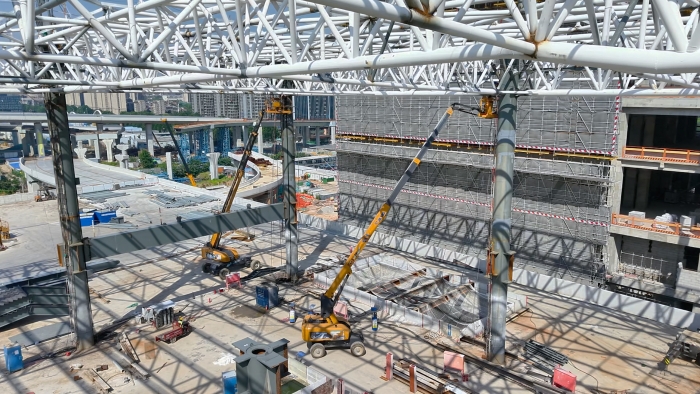 以徐工XGS40K為代表的十余臺徐工高機有的“一枝獨秀”,平穩(wěn)變幅直指站房屋頂;有的精準定位,靈活探入桁架之間緊貼焊接點,成為保障鋼桁架高空焊接作業(yè)的主力軍,熱火朝天的為祖國交通樞紐建設(shè)貢獻力量。