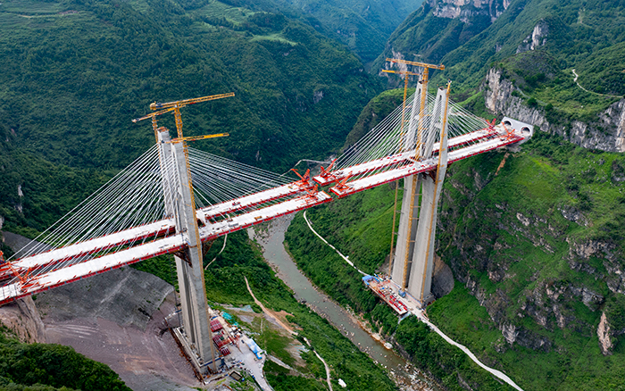 在黔中腹地懸崖峭壁間的烏長高速公路金旗特大橋項目上,徐工群塔與施工升降機協(xié)同作業(yè),助力世界最高深山峽谷連體斜拉橋建設(shè)。