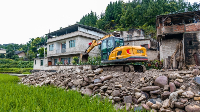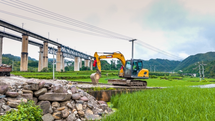雨季施工,場地濕滑狹窄,對設(shè)備靈活性、可靠性和機(jī)手技術(shù)都是嚴(yán)峻的考驗。在這片泥濘的稻田邊、陡峭的坡地上,身披“徐工金”的XE75GA挖掘機(jī),正化身開路先鋒,為苗鄉(xiāng)新居夯下第一塊基石。