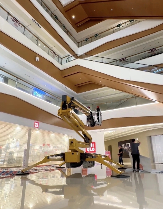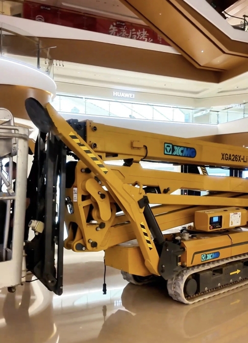 在杭州某大型商場,徐工XGS26X-Li將四只“蜘蛛腿”穩(wěn)穩(wěn)“扎根”在商場中庭,正在向玻璃圍欄下方的墻壁伸展臂架。超窄車身“溜”進商場、伸縮臂架“瞄”準墻面,這是徐工蜘蛛車在商場進行維修保養(yǎng)的日常。而看似日常的施工,需要面對三關“難題”。