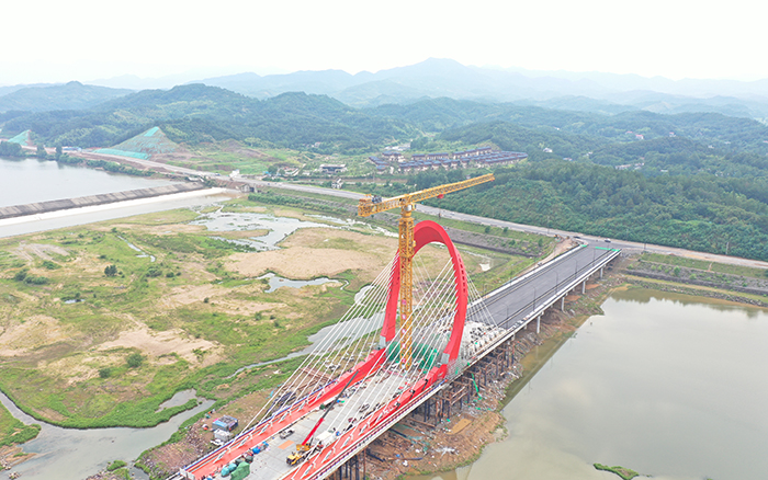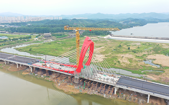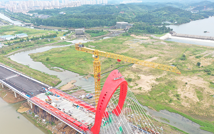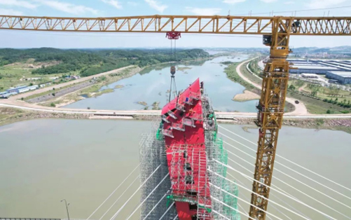 在大別山腹地、金寨縣史河河畔,“紅色搖籃”傲視遠(yuǎn)方,徐工XGT2230-100S塔機(jī)揮舞著巨臂,隨著重達(dá)40噸的主橋鋼塔柱最后一個節(jié)段起吊安裝到位,金寨史河大橋主塔順利合龍。