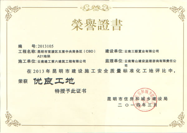 祝賀五里中央商務區(qū)項目獲得2013年昆明市標準工地優(yōu)良工地稱號