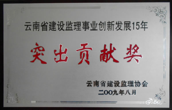 2009年云南省建設(shè)監(jiān)理事業(yè)創(chuàng)新發(fā)展15年“突出貢獻(xiàn)獎(jiǎng)”建設(shè)監(jiān)理企業(yè)