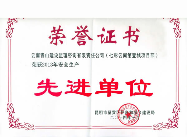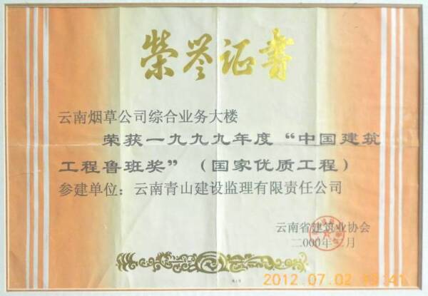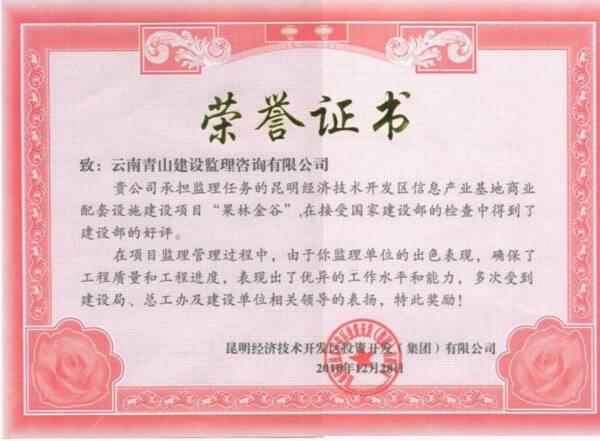 公司于2009年獲得云南市政府頒發(fā)的云南省建筑業(yè)發(fā)展“突出貢獻(xiàn)企業(yè)”。2009年獲得云南省建設(shè)監(jiān)理事業(yè)創(chuàng)新發(fā)展15周年“突出貢獻(xiàn)獎(jiǎng)”,2004年被建設(shè)部評(píng)為全國(guó)先進(jìn)工程監(jiān)理單位。2000年、2003年兩次被云南省建設(shè)廳評(píng)為云南省先進(jìn)工程建設(shè)監(jiān)理單位。 公司于2004年獲得建設(shè)部授予的全國(guó)先進(jìn)監(jiān)理企業(yè)稱(chēng)號(hào),2000年、2003年兩次被云南省建設(shè)廳授予云南省先進(jìn)工程建設(shè)監(jiān)理企業(yè),2009年8月榮獲云南省建設(shè)監(jiān)理協(xié)會(huì)授予的“云南省建設(shè)監(jiān)理事業(yè)創(chuàng)新發(fā)展15周年突出貢獻(xiàn)獎(jiǎng)”,2009年9月榮獲云南省人民政府授予的“云南省建筑業(yè)發(fā)展突出貢獻(xiàn)企業(yè)”獎(jiǎng)。