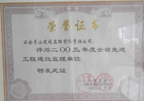 2003年云南省建設(shè)廳評(píng)為云南省先進(jìn)工程建設(shè)監(jiān)理單位榮譽(yù)
