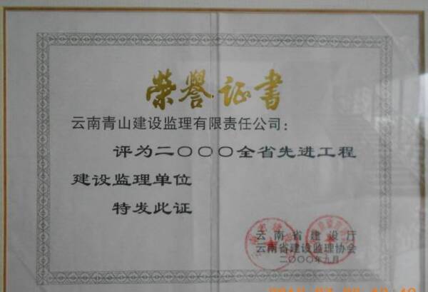 2000年云南省建設(shè)廳評(píng)為云南省先進(jìn)工程建設(shè)監(jiān)理單位榮譽(yù)證書(shū)