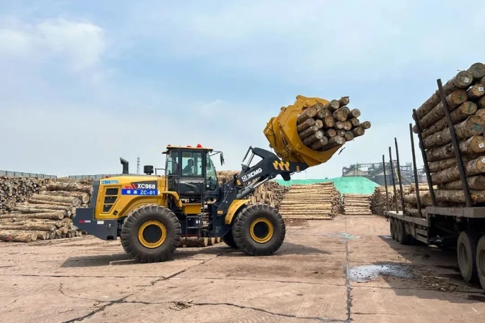 隨著滿載原木的貨輪緩緩靠岸,日照港瞬間切換為一派繁忙景象,20臺徐工XC968I夾鉗機迅速啟動、排列有序登上甲板,將原木從入港船舶上夾起、轉(zhuǎn)運至等待裝運的卡車,動作一氣呵成。