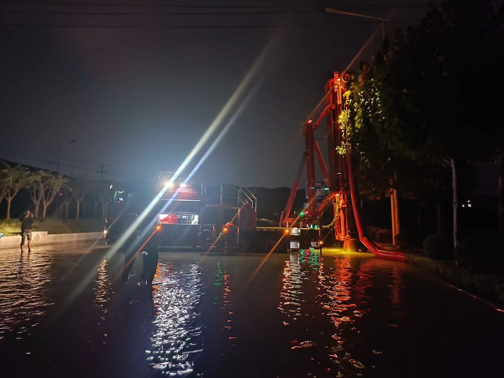 據(jù)悉,趕往此地需經(jīng)過一段深約1米的積水路段,普通救援車輛難以到達(dá),徐工垂直式排水搶險車GP35C憑借硬核涉水能力順利通過,于晚上8時率先抵達(dá)現(xiàn)場。短暫準(zhǔn)備后,救援人員采用垂直車輛臂架,將水泵放入窨井中抽排水的救援方案,水帶蜿蜒90米,將積水排入附近河道。