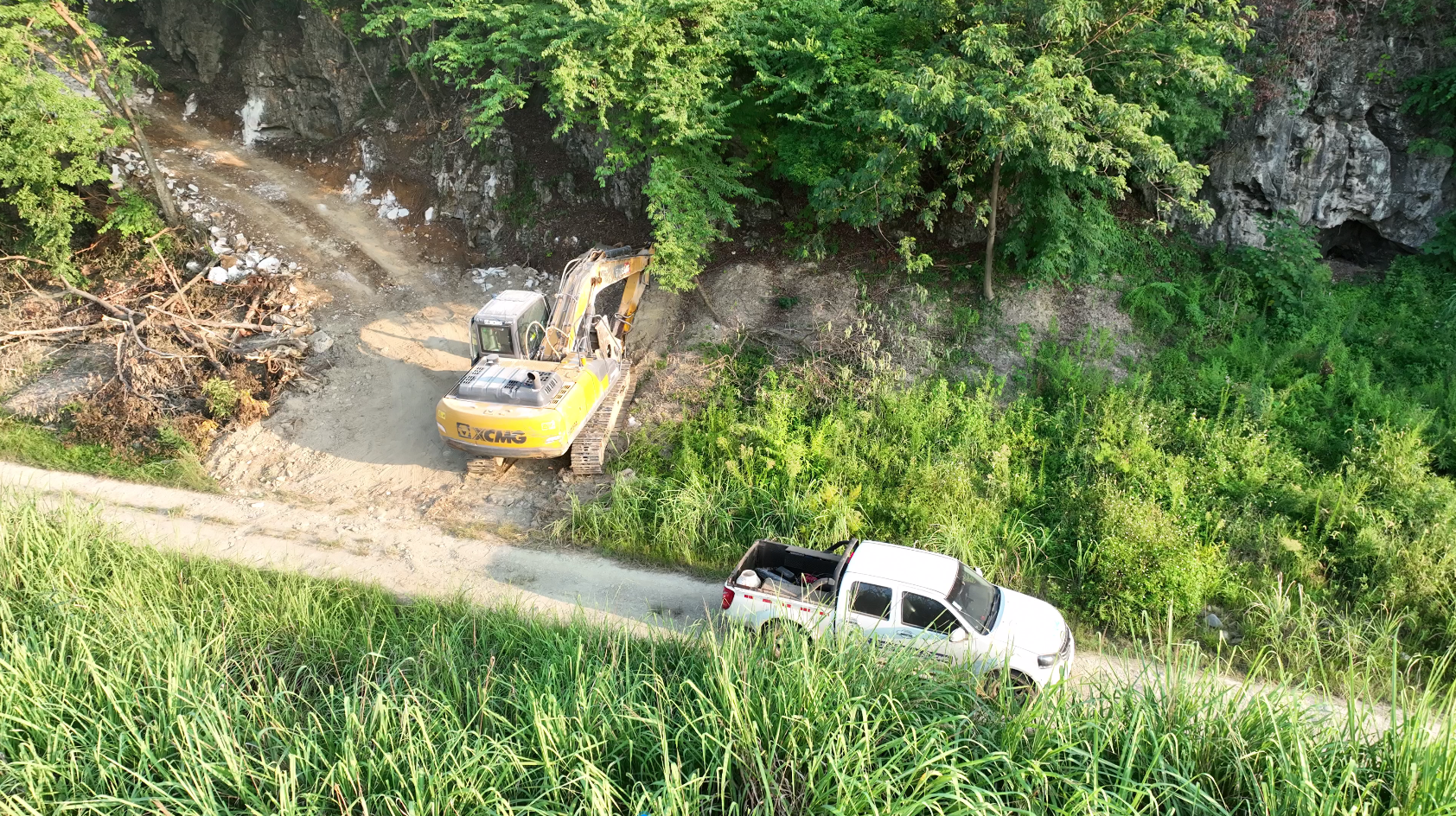 密不透風(fēng)的山林將正在作業(yè)的挖掘機完全擋住,只聽見破碎錘的聲音。