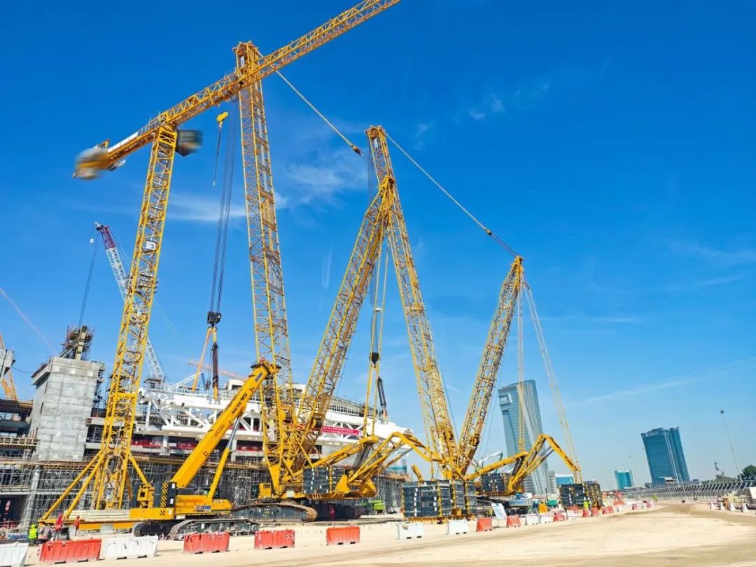 萬里之外的中東沙漠,2034年世界杯主場館建設(shè)現(xiàn)場,XGC15000A與XGC12000領(lǐng)銜組成"鋼鐵艦隊(duì)"。