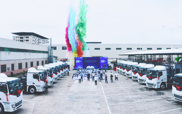 近日,百臺(tái)徐工新能源重卡交付儀式在“世界客都”——廣東梅州如期舉行,助力當(dāng)?shù)厣笆?、水泥輔料及煤炭運(yùn)輸。客戶(hù)及徐工汽車(chē)代表等百余人參加活動(dòng)。