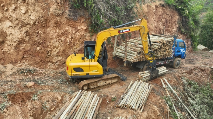 在鄭俊負(fù)責(zé)的林場,每節(jié)木材長度2.6米,徐工XE85GF一次可以夾10節(jié)以上的木材,重量超過1噸,而之前的輪挖夾裝0.6噸木材已是極限。