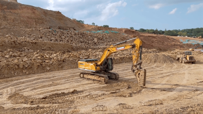 該設(shè)備搭載的低速大扭矩發(fā)動機與大排量主泵協(xié)同發(fā)力,15100J的超大沖擊力輕松解體圍巖巨石,破碎后的骨料直接用于站區(qū)圍擋澆筑填充,實現(xiàn)資源閉環(huán)利用。