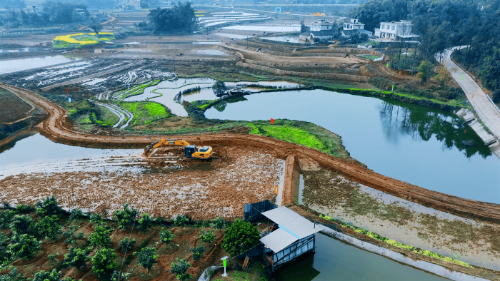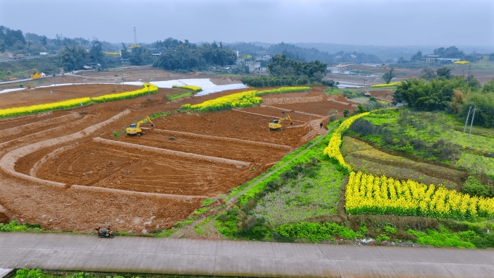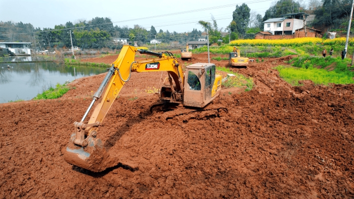 洪雅向東90公里,是仁壽縣,作為四川省產(chǎn)糧大縣,仁壽曾因田塊細(xì)碎導(dǎo)致機(jī)械化率不足。在5000畝的高標(biāo)準(zhǔn)農(nóng)田建設(shè)中,項(xiàng)目方集結(jié)18臺徐工挖掘機(jī),以“日均30多畝”的速度搶抓工期。