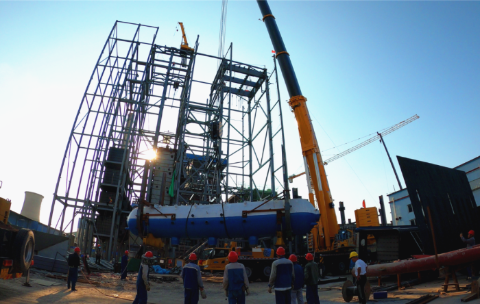 由于場(chǎng)地狹窄,障礙物環(huán)繞,集氣包還需精準(zhǔn)送入已建車(chē)間內(nèi)部,車(chē)間上方同樣阻礙重重,給施工增加了難度。