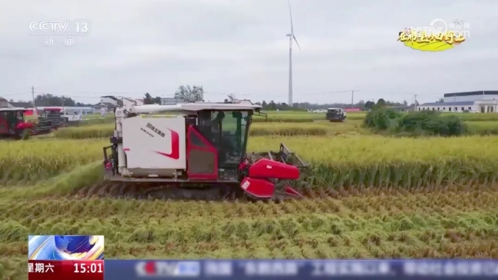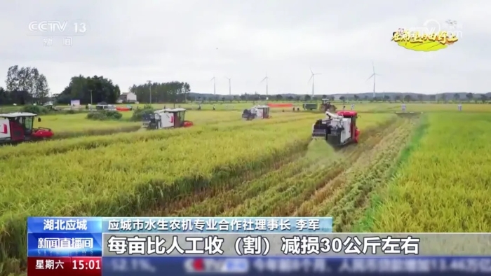9月20日,中央電視臺(tái)新聞?lì)l道《新聞直播間》“在希望的田野上”欄目將鏡頭對(duì)準(zhǔn)湖北應(yīng)城,報(bào)道了八臺(tái)徐工XR720履帶式谷物聯(lián)合收獲機(jī)在當(dāng)?shù)亻_(kāi)展大規(guī)模糯稻收割的豐收盛景——履帶滾滾,金黃的稻穗迅速被吞入機(jī)器,頃刻間完成收割、脫粒、清選等一系列作業(yè),顆顆飽滿的籽粒穩(wěn)穩(wěn)落入糧倉(cāng)。