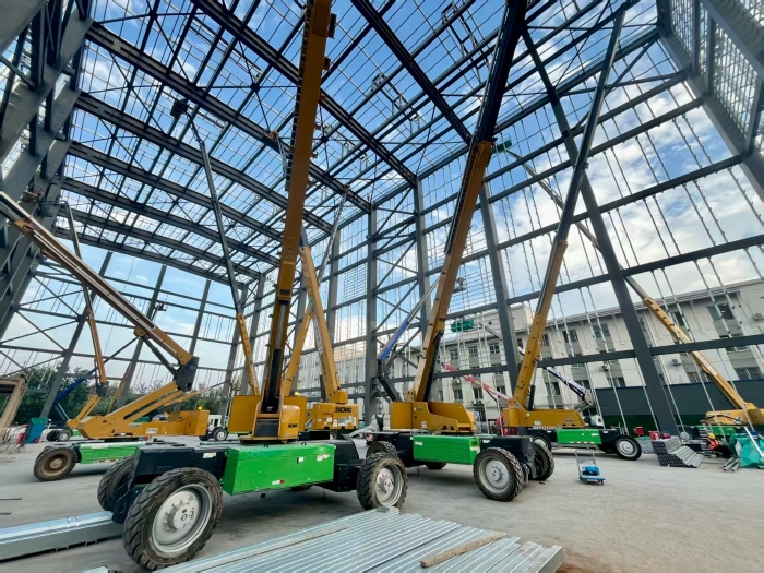 多臺(tái)設(shè)備組成的"綠色戰(zhàn)隊(duì)"展現(xiàn)出強(qiáng)大的協(xié)同作業(yè)能力,其靈活的轉(zhuǎn)向模式和強(qiáng)大的通過性在密集的鋼構(gòu)件中穿梭自如,大幅提升了焊接安裝的效率,為這項(xiàng)重點(diǎn)工程的順利推進(jìn)提供了強(qiáng)有力的高空保障。
